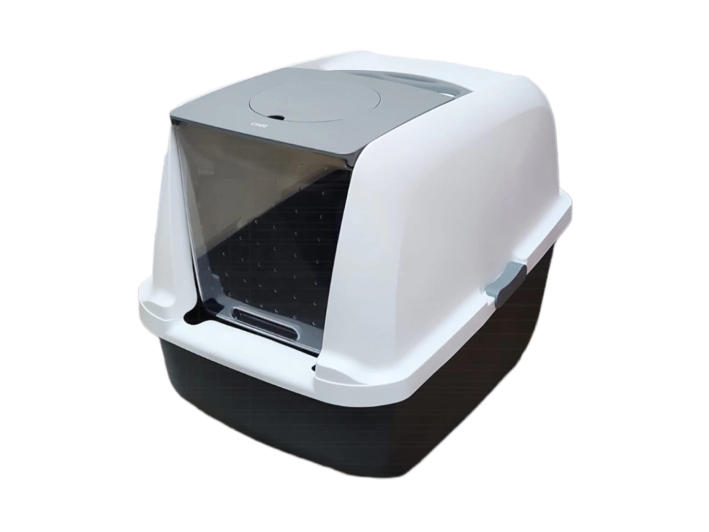La puerta translúcida tiene bisagras para que el gato pueda entrar y salir con comodidad. También puede quitarse si lo prefieres. Por último, la manija en la parte superior te permite transladarla cómodamente. Por otra parte evita que caiga el material absorbente al suelo, y retiene los olores fuertes.